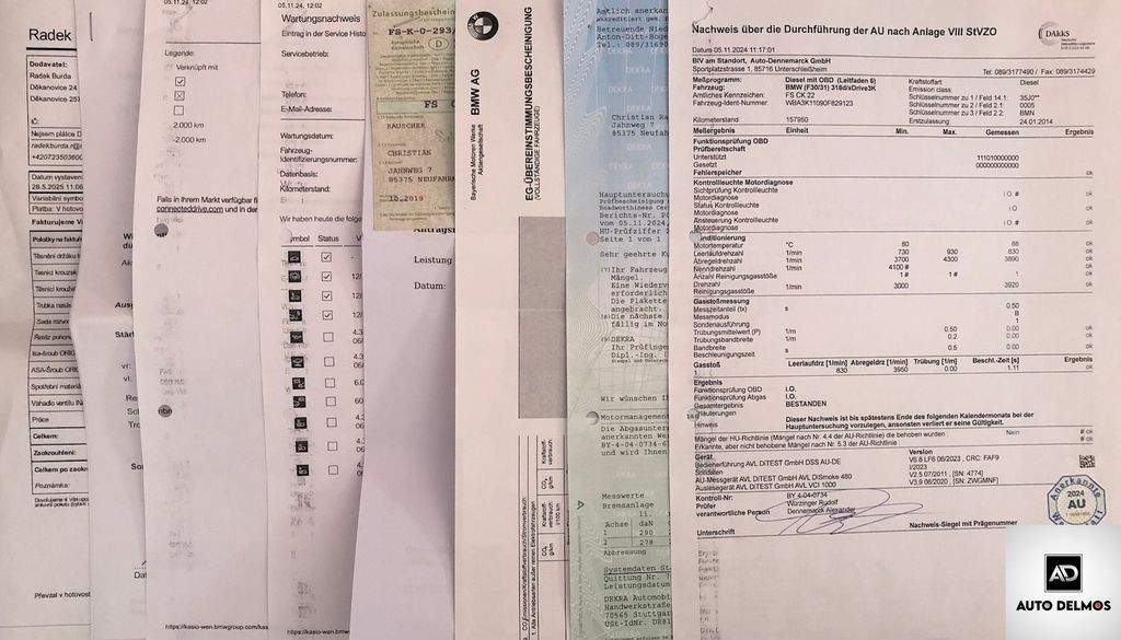 VIN-WBA3K11090F829123 -BMW 318 318d F31/2014/MAN6; 1MAJ-ZÁRUKA DO 2027 Vůz po 1. majiteli; SERVISNÍ KNIHA PO VELKÉM SERVISU 5/2025 VČ ROZVODU MOTORU - PRODLOUŽENÁ ZÁRUKA V CENĚ OD DOBY PRODEJE PO DOB12MĚS. MOŽNOST PRODLOUŽENÍ AŽ NA 36 MĚSÍCŮ.; Pravidelný servis veden v síti autorizovaných servisů BMW - poslední servis proveden v 165.700 km 05/2025-- možnost výhodného financování vozu a prodloužené záruky. Certifikát najetých kilo; roku výroby a původu vozu od nezávislé společnosti CEBIA; DEKRA; BMW AUTO; Další informace naleznete na www.DELMOS.cz. nabídka není nabídkou ve smyslu §1731 nebo §1732 občanského zákoníku; SADA ZIMNÍCH ALU KOL; --služby ConnectedDrive; osobní profil; dálkové služby; dynamická kontrola stability (DSC) vč. Dynamic Tractions Control (DTC); Performance Control; dělicí síť zavazadlového prostoru; alarm; .ConnectedDrive; dynamická kontrola stability (DSC) vč. Dynamická kontrola trakce (DTC);