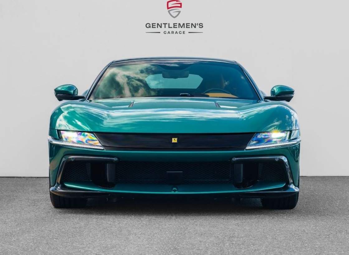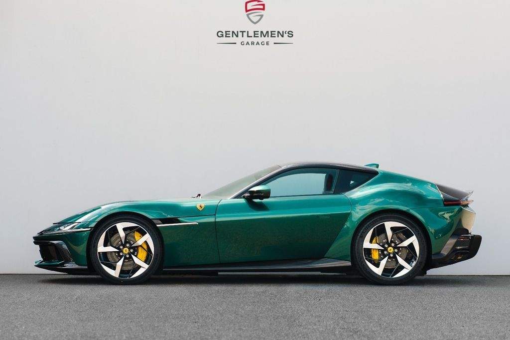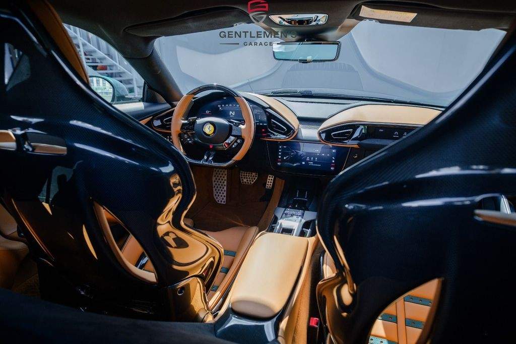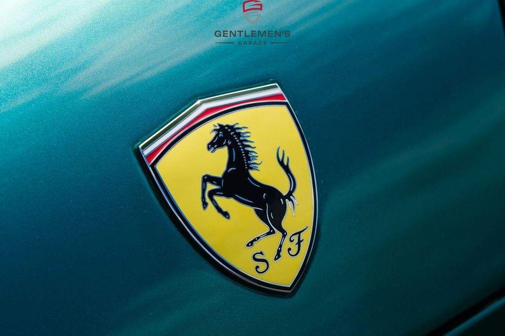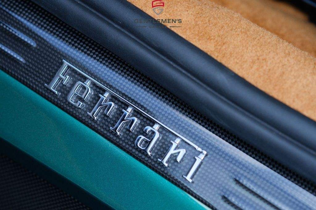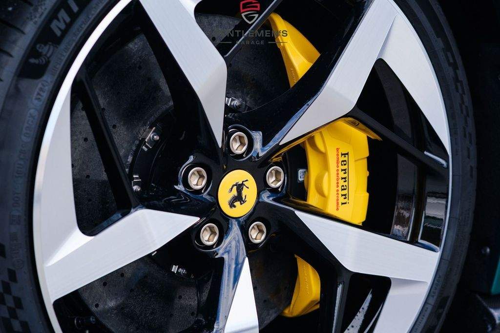Front radar with Adaptive Cruise Control (ACC) Air quality sensor Passenger display Surround view system Automatic boot lid system Large size interface Wireless smartphone charger Digital rear-view mirror MyFerrari Connect activated MyFerrari Connect readiness hardware Emergency call system Two-tone bodywork – Nero DS 1250 Special 2-layer exterior colour – Verde Pino 18 (ExtrArange) Yellow brake calipers Rear diffuser in carbon fibre Carbon fibre underdoor covers Exterior sill kickplates in carbon fibre Carbon fibre front spoiler Gloss black wheels Titanium wheel bolts Michelin tyres Scuderia Ferrari shields Active Matrix LED headlights Black tailpipe tips Daytona racing seats Leather passenger compartment inserts in Cuoio 4609 Coloured upper dashboard in Cuoio 4609 Cavallino stitched on headrests in Verde 1097 Leather perforated inserts Central part of seats in leather Carbon fibre steering wheel with LEDs Coloured steering wheel in Cuoio 4609 Heated steering wheel Coloured standard stitching in Verde 1097 Coloured leather in Verde 4305 Upper part of centre console in carbon fibre Aluminium driver and passenger footrests;