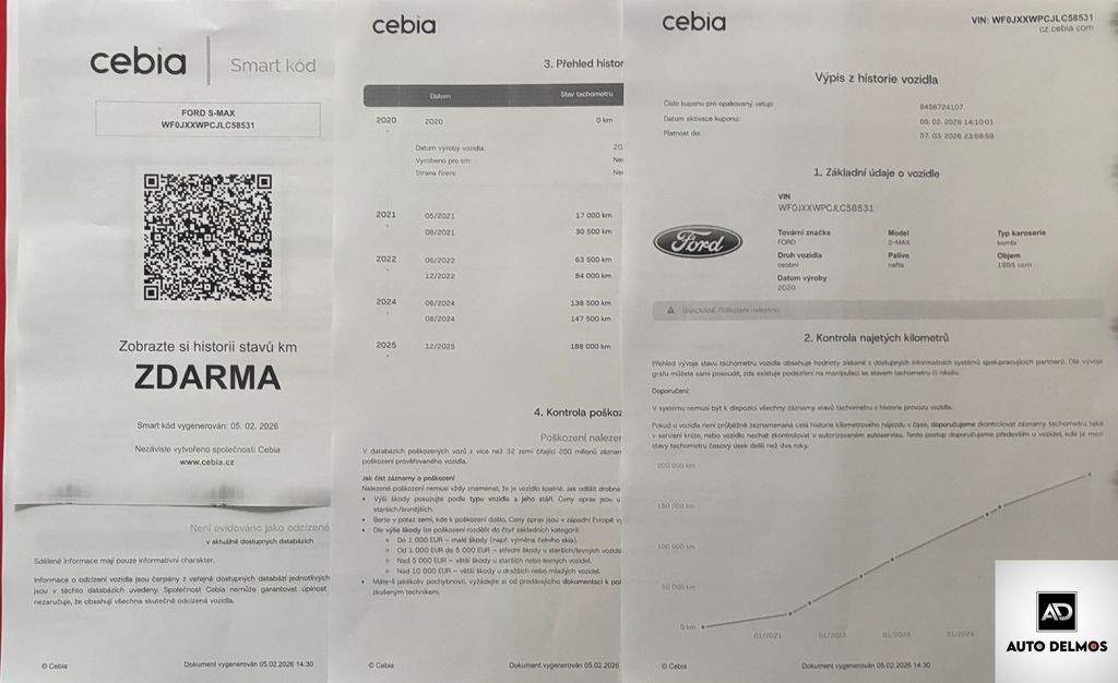 VIN:WF0JXXWPCJLC58531--Ford S-Max 2.0 EcoBlue TITANIUM-SPORT; 1MAJ; DPH-MANUÁL-ZÁRUKA 24MĚS - Vůz po 1. majiteli; servisní kniha vedená po celou dobu provozu . Pravidelný servis v síti autorizovaných servisů FORD - PO KOMPLETNÍM SERVISU V 182.000 KM 10/2025; možnost odpočtu DPH; možnost výhodného financování vozu a prodloužené záruky. Certifikát najetých kilo; roku výroby a původu vozu od nezávislé společnosti CEBIA; DEKRA; FORD AUTO. Udržovaný a zachovalý stav. MOŽNOST PRODLOUŽENÉ ZÁRUKY AŽ NA 36 MĚSÍCŮ . nabídka není nabídkou ve smyslu §1731 nebo §1732 občanského zákoníku MODEL A PROVOZ 2021-TAŽNÉ ZAŘÍZENÍ - SADA ZIMNÍCH ALU KOL; LED SVĚTLA + FG524-EL.ADAPTIVNÍ TEMPOMAT; 5MÍS; NAVIGACE; .PROVĚŘENÉ FLEET VOZIDLO.- Kód kuponu: 8456724107 -- https://cz.cebia.com/?s_coupon=8456724107;