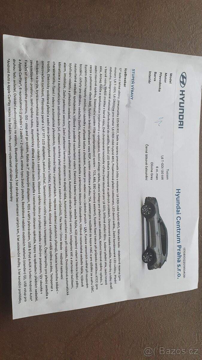 TEL: 603310017 OKR: NYMBURK Prodám velmi pěkný Hyundai Tucson 1.6 T-GDI 132 kW (180 k) s manuální převodovkou ve výbavě IceBreaker. Rok výroby 2019; první registrace 2020. Najeto 75 000 km; barva Olivine Grey. Auto je pravidelně servisované; k dispozici servisní knížka. Poslední servis: leden 2026. STK platná do 12/2027. Výbava mimo jiné zahrnuje: - parkovací kameru a parkovací senzory - vyhřívaná přední sedadla - vyhřívaný volant - velký dotykový displej - Apple CarPlay / Android Auto - tempomat a další asistenční systémy - originální vyndavací tažné zařízení - zimní pneumatiky Více informací viz foto. Auto je ve velmi dobrém stavu; spolehlivé a pohodlné rodinné SUV. Cena: 375 000 Kč 603310017;