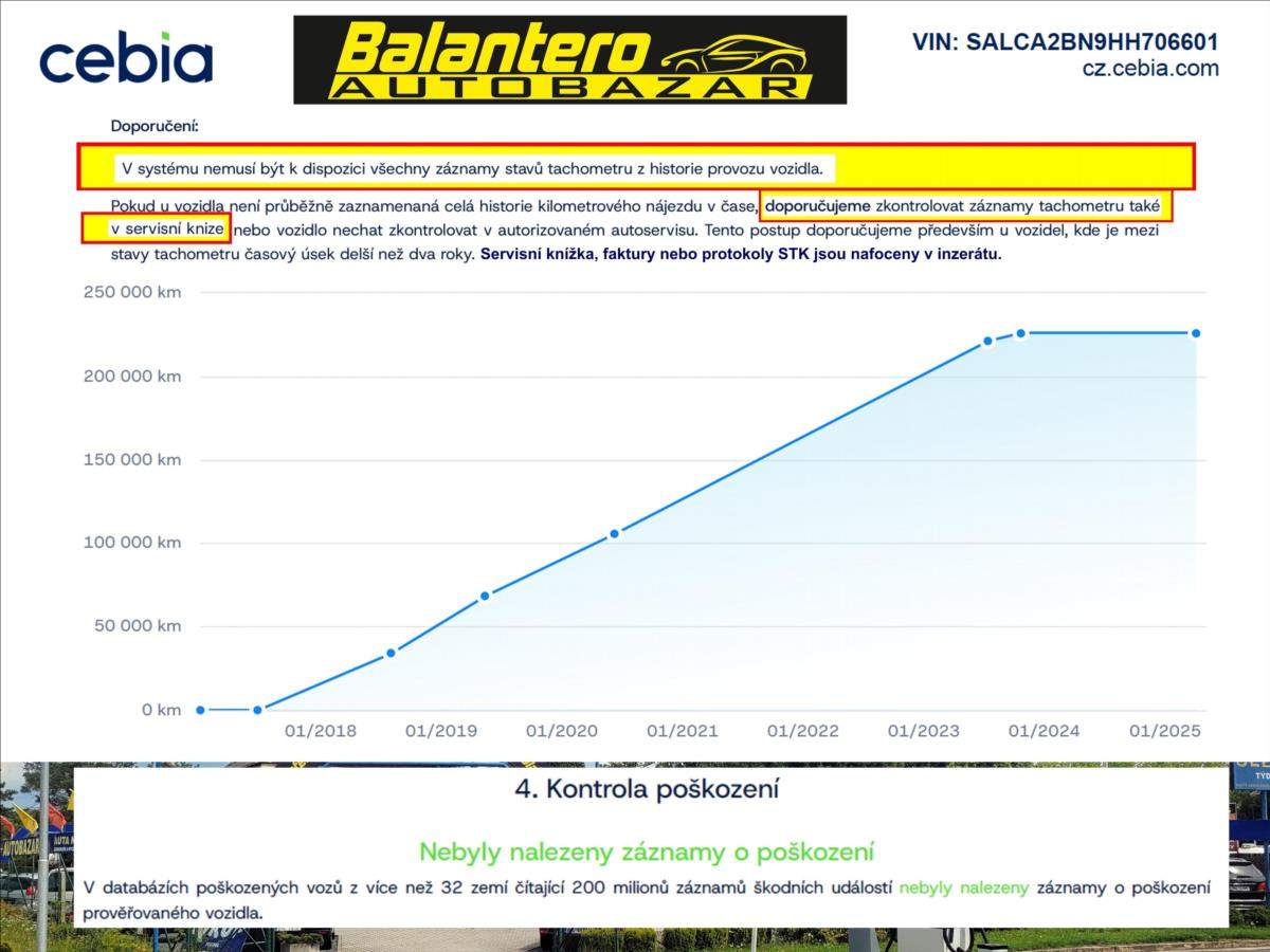 Spotřebitelský úvěr možný, NÍZKÉ SPLÁTKY, akontace od 0%, informujte se - 601 002 157. Prověřeno CEBIA. záruka PŮVODU a KILOMETRŮ.; Spotřebitelský úvěr možný; Perfektní technický stav; SERVISNÍ KNÍŽKA - pravidelný servis; 2x klíč DO; pěknné zimní pneu; odpočet DPH; cena bez DPH: 304.958 Kč; VIN: SALCA2BN9HH706601; záruka PŮVODU a NAJETÝCH KILOMETRŮ. Prověření CEBIA; protokol k dispozici. Úsporný motor; dlouhodobá spotřeba 6; 1L/100km; Kontakt: 601 002 157; rádi Vám poradíme. Nejedná se o návrh na uzavření smlouvy (nabídku) ve smyslu § 1731 a §1732 zákona č. 89/2012 Sb.; Občanského zákoníku. Společnost Balantero s.r.o. si vyhrazuje právo uzavření všech smluvních vztahů písemně.;