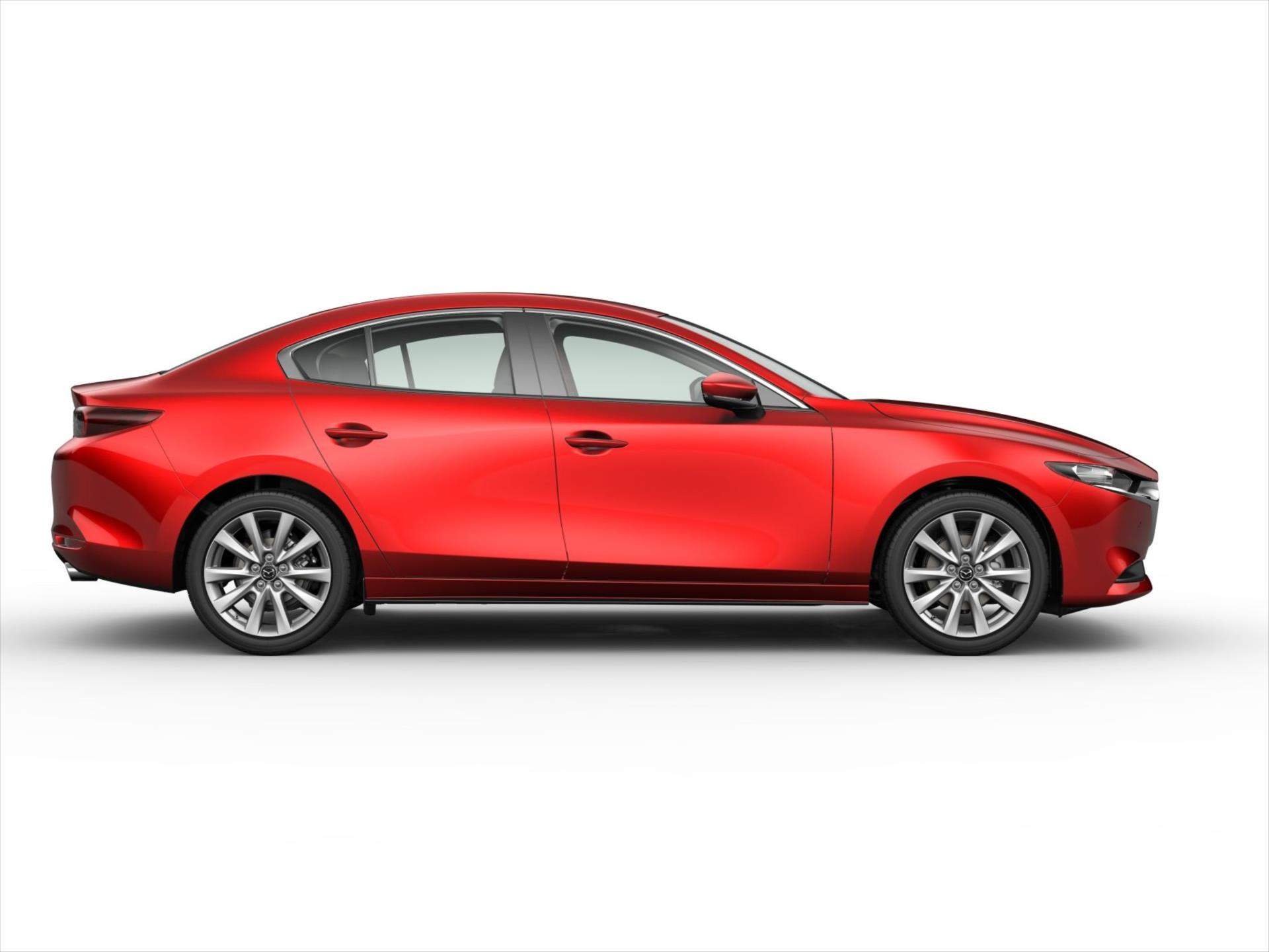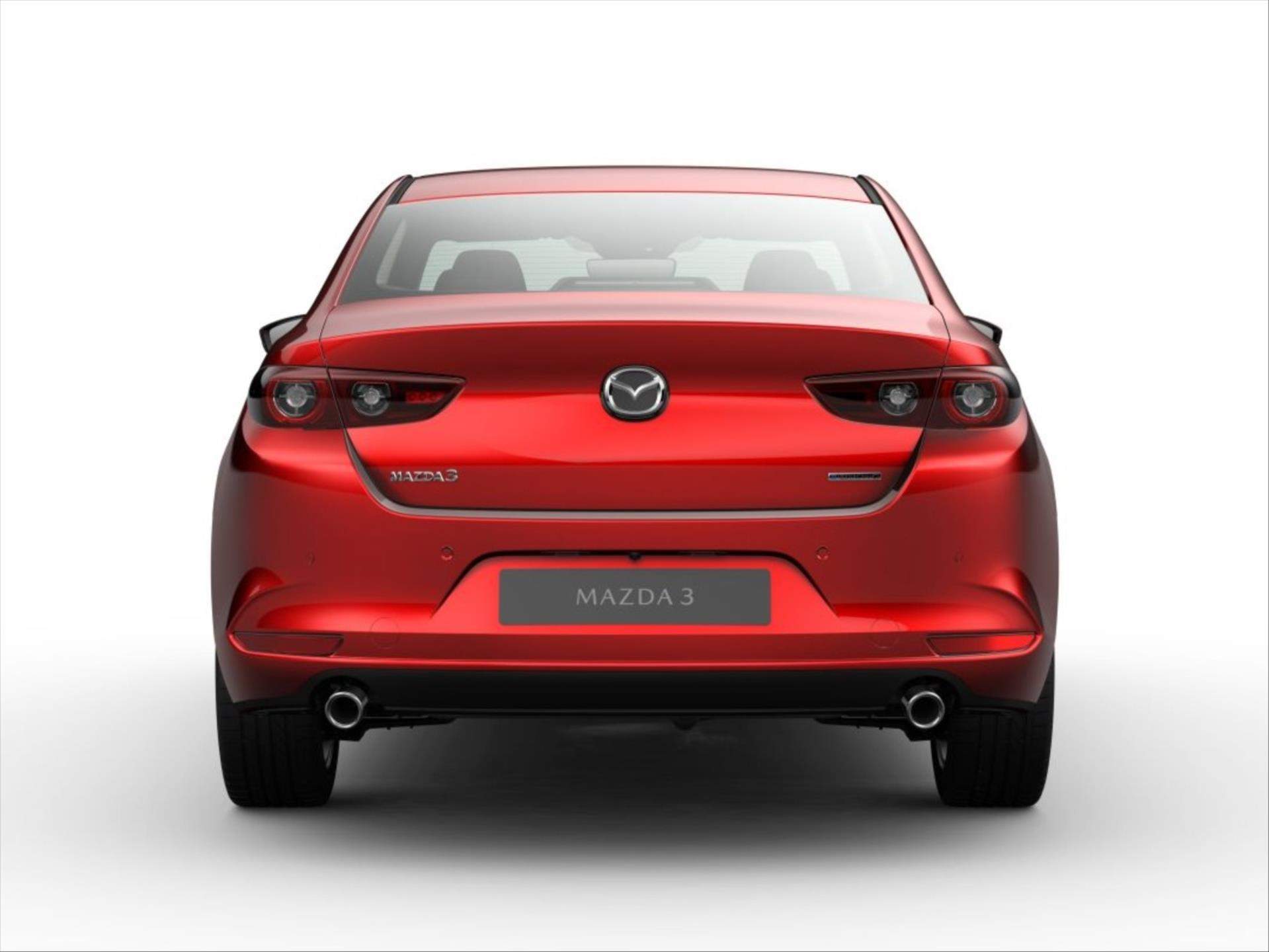 Foto vozu ilustrační s reálnou barvou; Záruka 6let /150.000 Km; Cena vč. aktivaci vozu v systémech Mazda; LED zadní kombinované světlomety; Vnější zpětná zrcátka v barvě karoserie; Ukazatele směru ve vnějších zpětných zrcátkách; Skryté stěrače; včetně ostřikovačů; Zadní spoiler (pouze hatchback); Barevný projekční head-up displej; 8.8' barevný displej; HMI ovladač (nový design); Digitální přístrojový štít; Elektrická parkovací brzda včetně funkce Auto Hold; Kožený volant (nový design); Ovládání audiosystému; Bluetooth® na volantu; Kožená hlavice řadicí páky; Přední centrální loketní opěrka; Barva čalounění stropu (hatchback: černá; sedan: šedá); Kolenní airbag na místě řidiče; Automatické zamykání dveří; Souprava na opravu pneumatik; Systém pro kontrolu tlaku v pneumatikách; G-Vectoring Control Plus (GVC+); Asistent rozjezdu do kopce; Dešťový a světelný senzor; Systém prevence nárazu v městském provozu (SCBS) včetně detekce chodců (AEB); Inteligentní brzdový asistent (SBS); Rozeznávání dopravních značek (TSR); Zadní parkovací senzory; Systém eCallAlarm; USBAM/FM rádio; 8 reproduktorů; Bluetooth®Apple Carplay/Android Auto; DAB digitální autorádio;