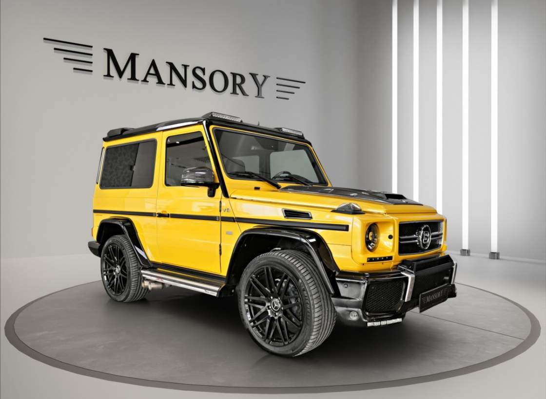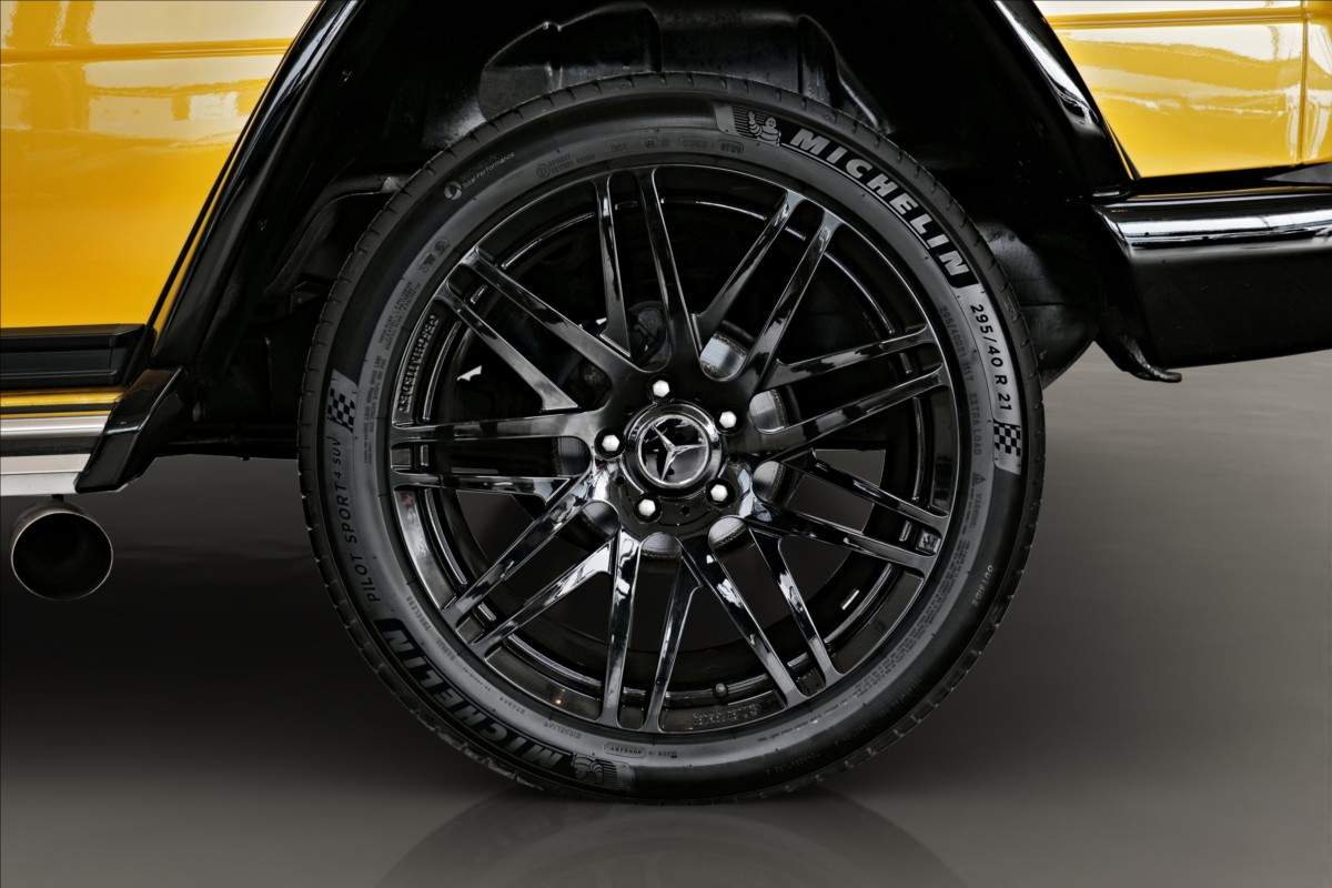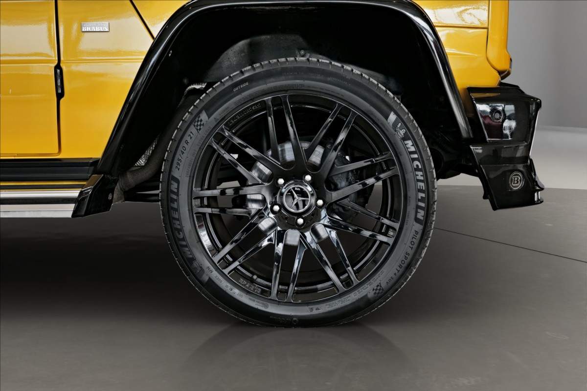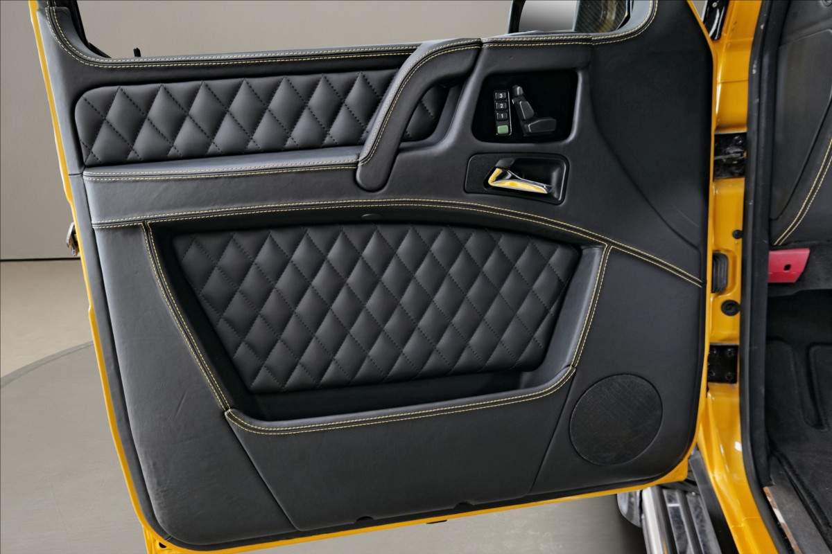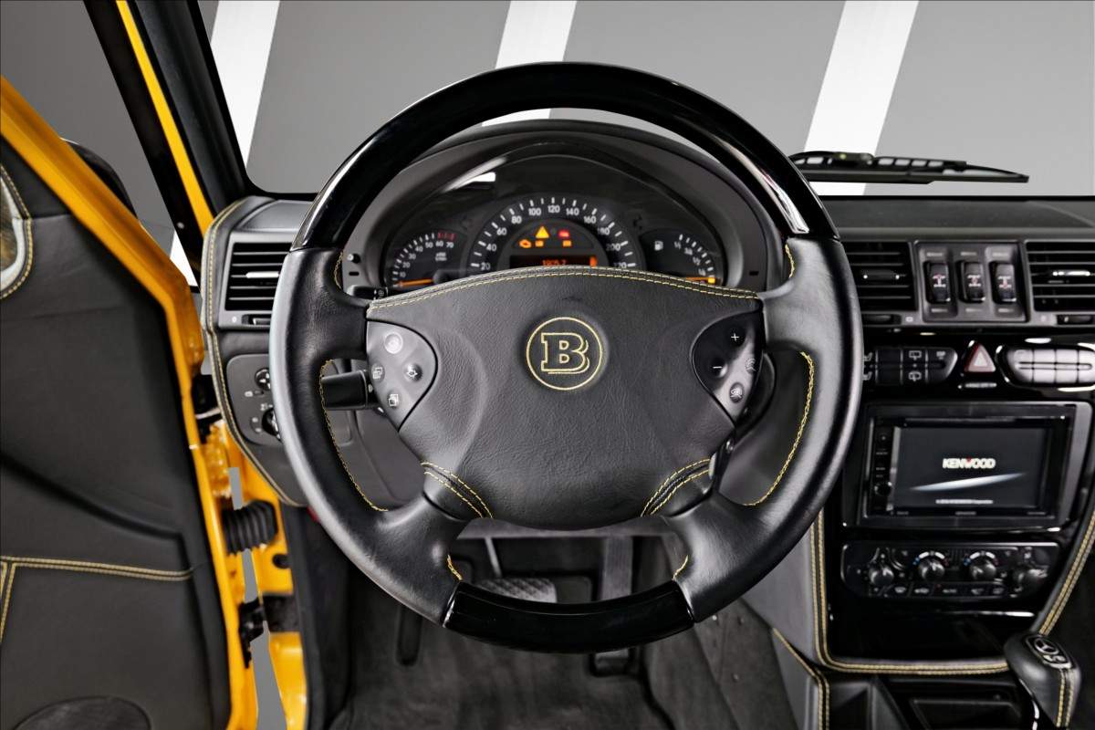 Dobrý den; máme na prodej Mercedes-Benz G500 Coupé Brabus. Vozidlo je lakované v žluté metalické barvě. Interiér je v černé kůži s kontrastním žlutým prošíváním. Další výbava vozidla: 21 palcové kované disky Brabus; Brabus přední a zadní nárazník; karbonový kryt kapoty Brabus; Led denní svícení Brabus; střešní led světla Brabus v karbonu; karbonové kryty zrcátek; 2din dotykové rádio Kenwood; parkovací kamera; multifinkční volant...;