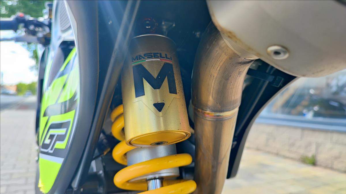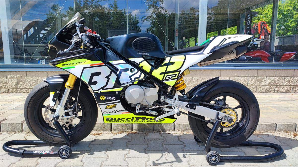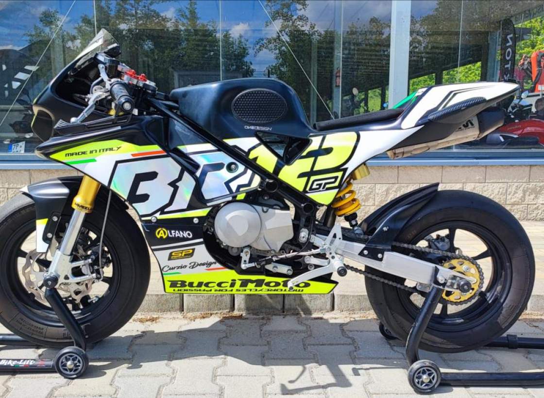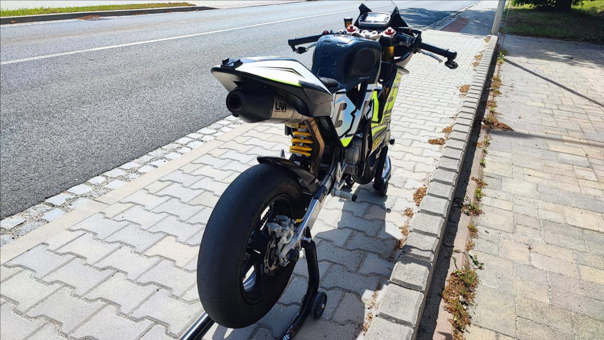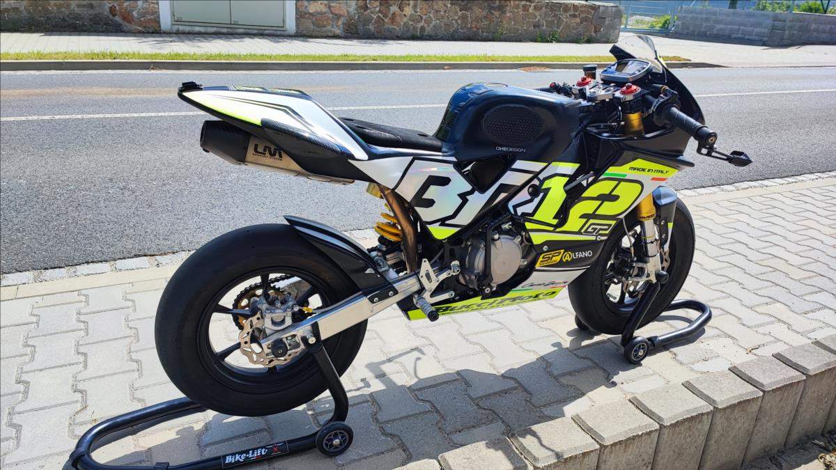 Mini GP; lehce ojetá s motorem Daytona Anima 4V 190; 21 MTH; perfektní technický stav; výbava v ceně; Quick shifter SP Electronics v hodnotě 10000Kč; EVR slipper clutch v hodnotě 16000Kč; Alfano 6 laptimer v hodnotě 12000Kč; zadní brzda na palec levé ruky v hodnotě 2500Kč; nahříváky VMC v ceně 5000Kč; stojany zadní v ceně; přední hodnota 2500Kč; motorka je na plně seřiditelném podvozku Masseli se štelovacími zátkami na předpětí; jinak včetně seřízení komprese a útlumu ve variantě extra + pružiny 8; 5Nm+. Brzdy jsou Formula double disc. Obuto do PMT Supersoft téměř nejeté. Špičkový stroj.;
