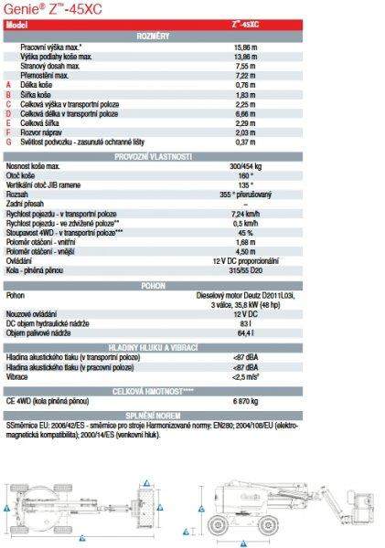 plošina kloubová terénní Genie Z-45 CX; (výrobce Terex v IT); rok 2022; 1. majitel; odpracováno jen 20 mth! motor 3V diesel Deutz 36 kW / 48HP; hmotnost 7.25t; pohon 4x4; dosah 15.86 m; boční dosah 7.22m; nosnost koše 454 kg; stoupavost 45%; nová revize; komplet dokumentace; 83 ltr phm; 64.4 ltr oleje; ID 1350538847_S; lokace Zlínský kraj; Volejte od Po-Pá/9-17hod nebo pište. (i whatsapp); Simona Zeman Galleová; Tel: +420 732 712 973;;