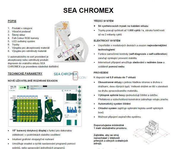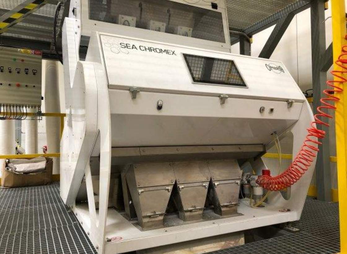 univerzální optický třídič / separátor - linka Cimbria SEA CHROMEX 3 (výrobce Dánsko); roky demontováno - uskladněno montáž; test i transport pouze po dohodě; rok 2018; 3-cestný; 3 vibrační podavače; rozlišení dle 3. barev; možnost nastavení třídění dle barevného spektra; nebo dle tvaru; třídící a vážící systém; šikmý skluz; full-colour RGB kamery; led světelný systém; 54 vystřelovacích vzduchových trysek na každém skluzu; automatický re-sort; dotykový displej; spotřeba vzduchu při 4barech = 25.2; napájeníV/Hz: 230/50 - 1Ph (L + N + PE); max. spotřeba energie: kVa 1.5; možno k třídění plastových drtí dle barev (PET flakesy) nebo např. granulátu (potraviny; káva); Prodej celého zařízení včetně: (nosné konstrukce; kompresoru; násypky; výsypky; magnetického separátoru a dopravních cest pro mate; ID 1732103103_S; lokace: severní Morava; Volejte od Po-Pá/9-17hod nebo pište. (i whatsapp); Simona Zeman Galleová; Tel: +420 732 712 973;;