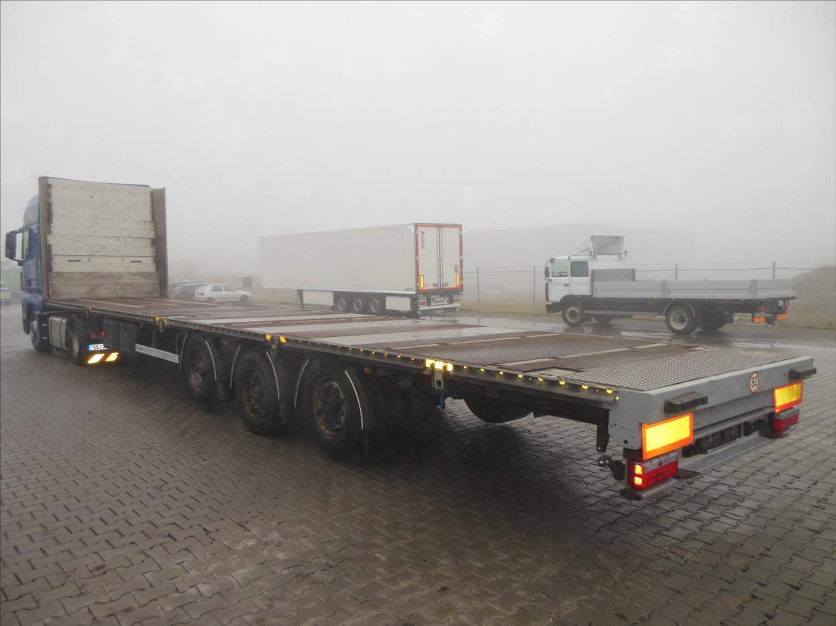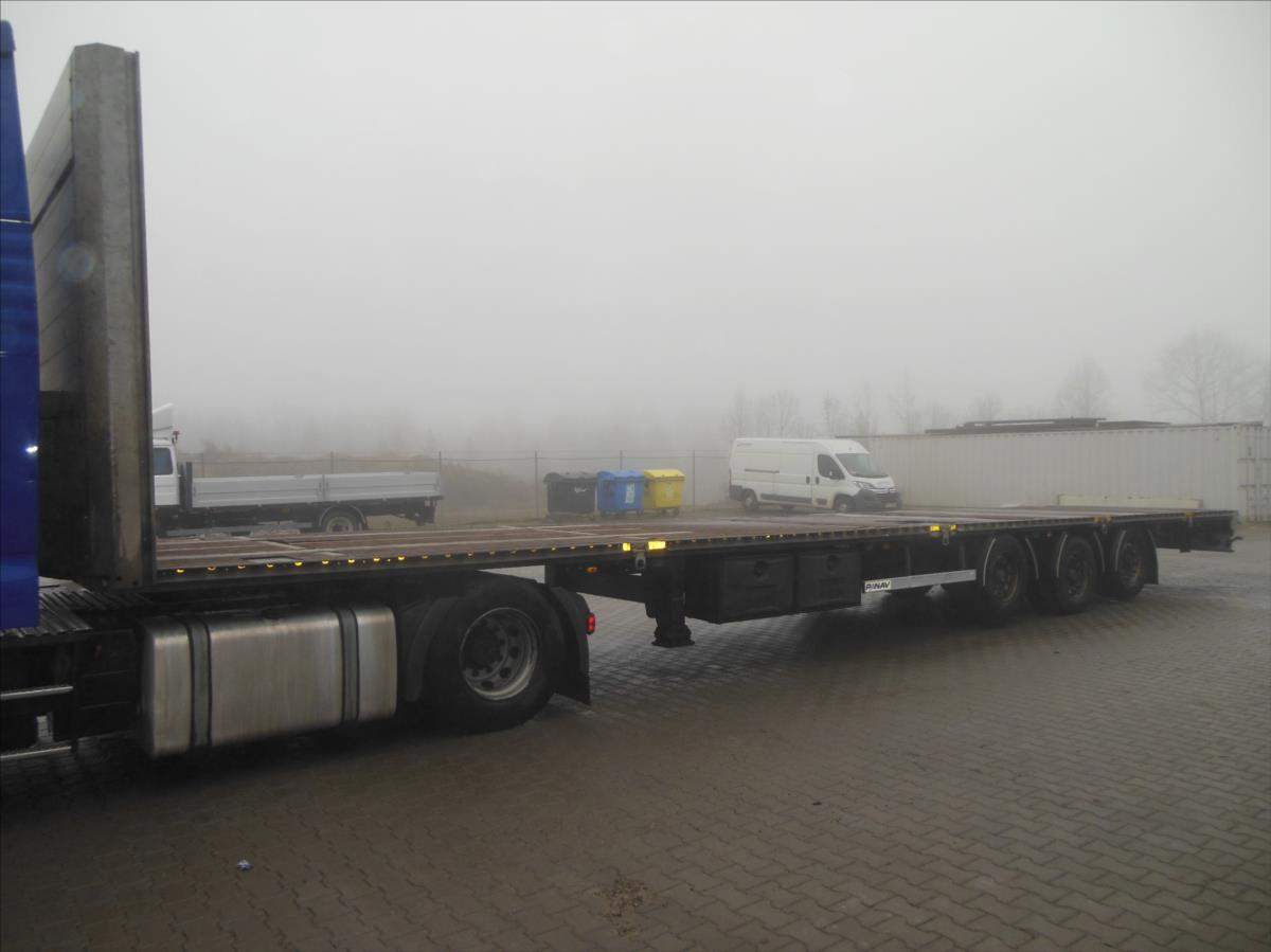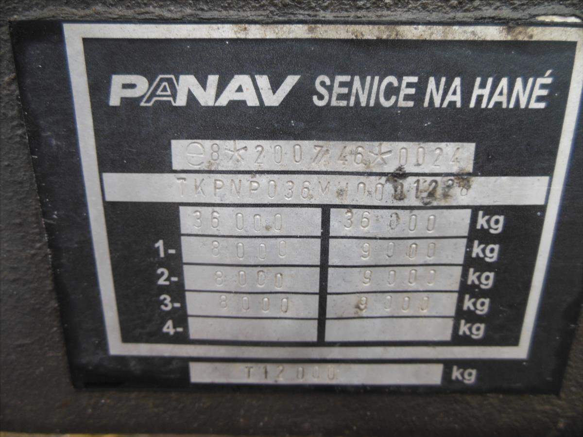 Návěs-valník; Panav NP036; LowDeck; Originál plato; Provoz 9/2017; 1 a 3 náprava zvedací; nápravy BPW; kapse pro klanice; 8 kusů zámků pro kontejnery; kotoučové brzdy; ABS; pneu 445/45 R19; 5 stav: 1 osa 7 a 14 mm; 2 osa 15 mm; 3 osa 11 a 6 mm; Provozní hmotnost 6100 kg; Celková hmotnost 36.000 kg.;