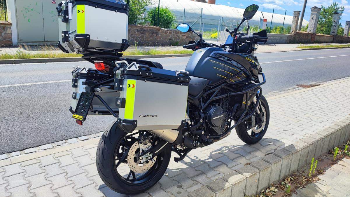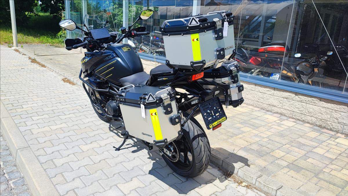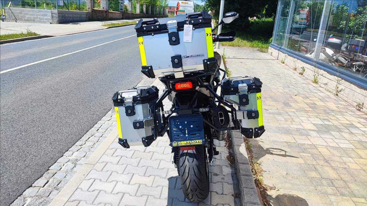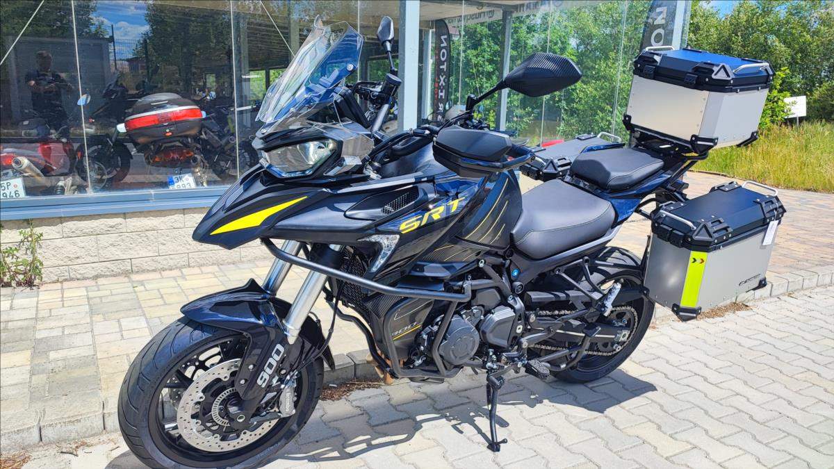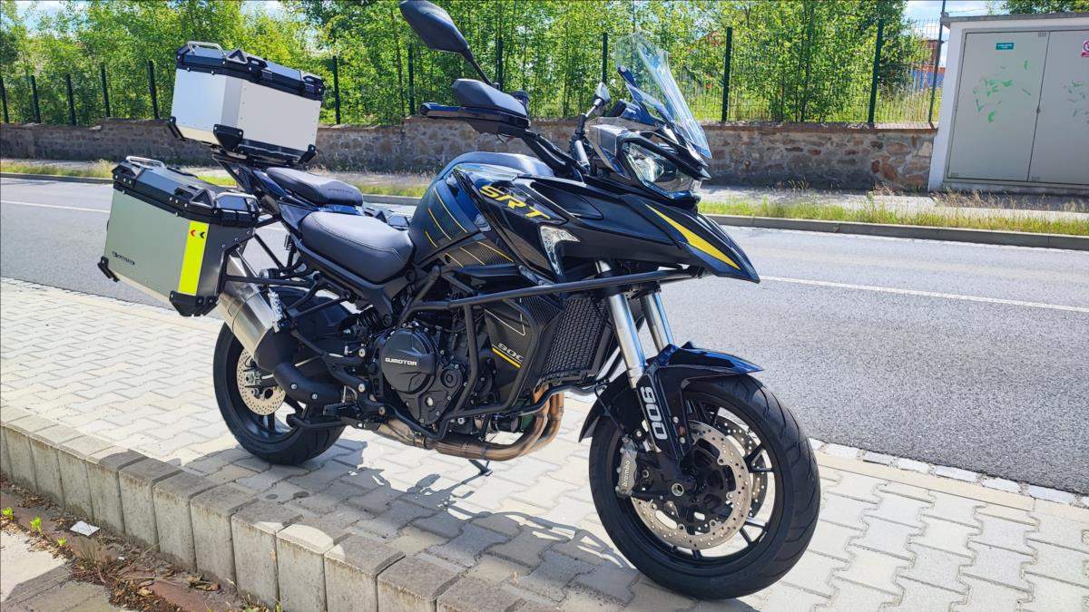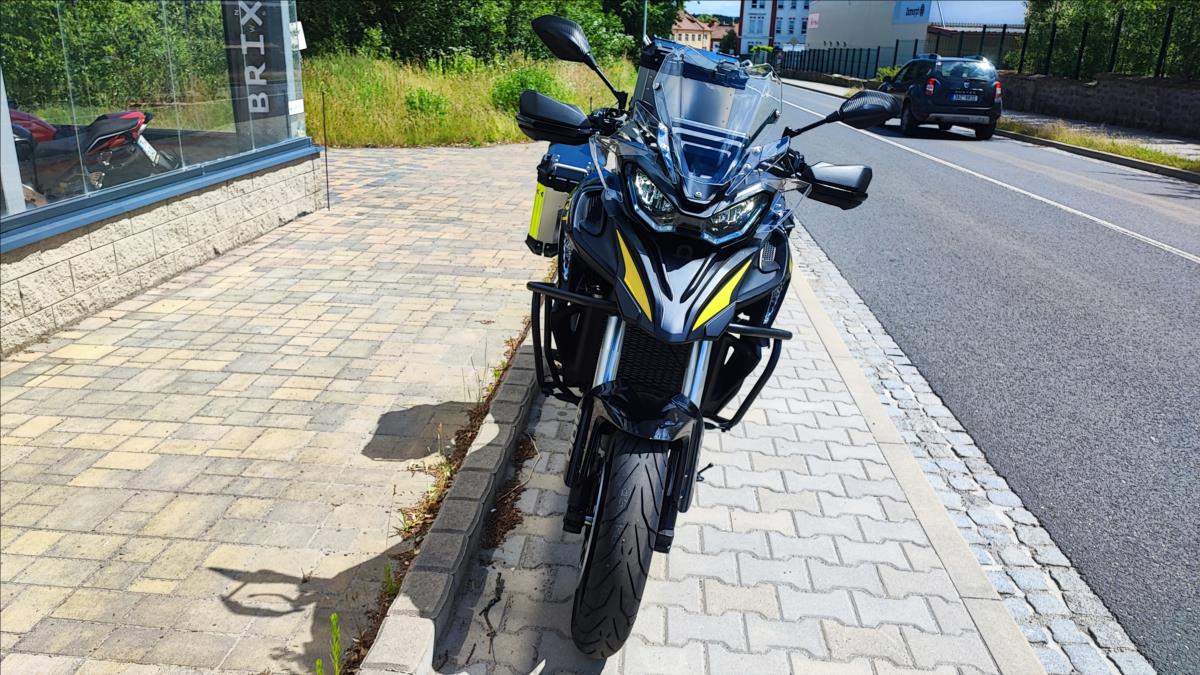 Nový motocykl; novinka roku 2025; cena včetně 3 alu kufrů; oboustraný QS; Tempomat; TFT; TC; radar na mrtvé úhly; přední kamera s DVR; zrcadlení a připojení telefonu; navigace; aplikace v telefonu; hlídání tlaku a teploty v penumatikách; vyhřívaná sedačka a rukojeti atd!!!; Technické údaje: Typ motoru 2-válcový řadový motor; kapalinou chlazený; Typ rozvodů DOHC; 8 ventilů; Objem válců 904 ccm; Vrtání / Zdvih 92 mm x 68 mm; Výkon motoru 70 kW (95 PS) při 9.000 ot./min; Točivý moment 90 Nm při 6.500 ot./min; Příprava směsi Elektronické vskřikování paliva; Způsob startování Elektrický startér; Spojka / ovládání Vícelamelová mokrá spojka; lankem; Převodovka / převod 6 rychlostní / sekundární převod řetězem; Emisní norma Euro 5+; Hlučnost při stání - dB; Emise CO2 - g/km; Spotřeba paliva 4; 7 litru / 100km; Palivo Benzin E5 / E10; Maximální rychlost 230 km/h; Konstrukce podvozku Trubkový rám / kyvka hliníkový profil; Přední odpružení Upside down vidlice; olejové tlumení; Zadní odpružení Nastavitelné odpružení; komprese a odskok; Zdvih předního kola 160 mm; Zdvih zadního kola - mm; Světlá výška 180 mm; Přední pneumatika 120/80R-19 / Maxxis MaxxVenture (bezdušová); Zadní pneumatika 180/70R-17 / Maxxis MaxxVenture (bezdušová); Přední brzda ABS 2x kotoučová radiální brzda Brembo 320 mm; Zadní brzda ABS Jednokotoučová brzda Brembo 260 mm; Rozměry motocyklu 2.260 mm / 950 mm / 1.405 mm; Rozvor 1.540 mm; Výška sedadla 835 mm; Objem palivové nádrže 24 litrů; Pohotovostní hmotnost motocyklu 263 kg (vč.všech kapalin; paliva a aku); Dostupné barvy Černá; bílá;