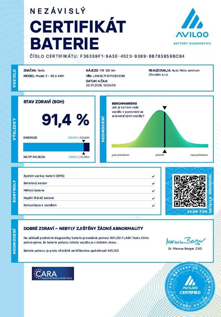 Tesla Model 3 Standard 208 kW RWD SOH 91; 4% (ODPOČET DPH) - cena uvedena vč. DPH; baterie 60 kWh - LRW3E7FS7PC833199; dovoz: EU; elektro; do provozu: 25.5.2023; najeto: 176126 km; pohon kol: zadní; automatická převodovka; STK do: 11/2027; přední a zadní parkovací senzory; parkovací kamera; přední a zadní vyhřívaná sedadla; procesor AMD RYZEN; BOOM BOX; MATRIX SVĚTLOMETY; WLTP 554 km. *MOŽNOST VYKOUPENÍ VAŠEHO STARÉHO VOZU PROTIÚČTEM* *MOŽNOST VÝHODNÉHO FINANCOVÁNÍ už bez nulové akontace* Pro nezávaznou kalkulaci nás neváhejte kontaktovat. Nutno vždy volat předem! Prohlídky možné i mimo pracovní dobu tel. 732710796 Mates auto. Nejedná se o návrh na uzavření smlouvy (nabídku) dle § 1731 zákona č. 89/2012 Sb.; občanský zákoník; ale o nezávaznou nabídku.;
