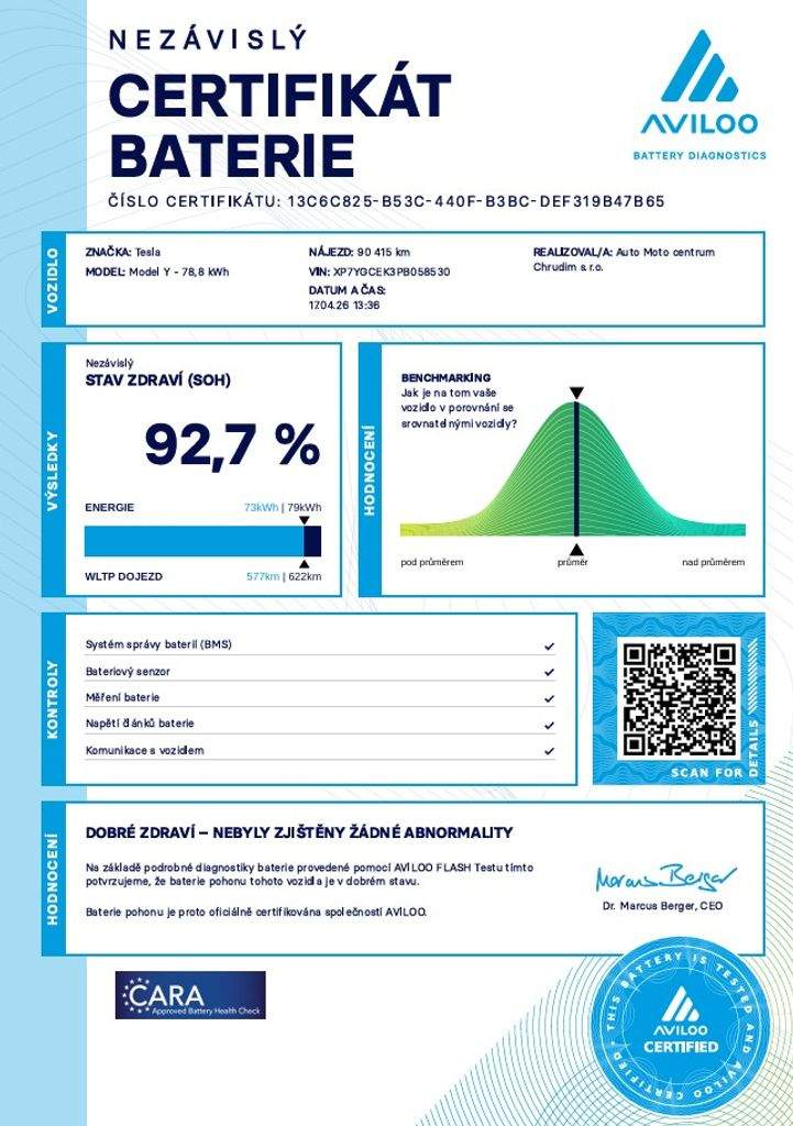 Tesla Model Y Long Range Dual Motor 378 kW SOH 92; 7% BERLÍN (ODPOČET DPH) - cena uvedena vč. DPH; baterie 78.8kWh - XP7YGCEK3PB058530; dovoz: Německo; elektro; do provozu: 20.12.2022; najeto: 90415 km; pohon kol: 4x4; automatická převodovka; STK do: 12/2027; vyhřívaná přední i zadní sedadla; vyhřívaný volant; parkovací kamera; procesor AMD RYZEN; tepelné čerpadlo; MATRIX SVĚTLOMETY; BOOM BOX; WLTP 560 km. Záruka na Akumulátor a hnací ústrojí 8 let nebo po ujetí 192.000 km (podle toho; co nastane dříve). *MOŽNOST VYKOUPENÍ VAŠEHO STARÉHO VOZU PROTIÚČTEM* *MOŽNOST VÝHODNÉHO FINANCOVÁNÍ už bez nulové akontace* Pro nezávaznou kalkulaci nás neváhejte kontaktovat. Nutno vždy volat předem! Prohlídky možné i mimo pracovní dobu tel. 732710796 Mates auto. Nejedná se o návrh na uzavření smlouvy (nabídku) dle § 1731 zákona č. 89/2012 Sb.; občanský zákoník; ale o nezávaznou nabídku.;