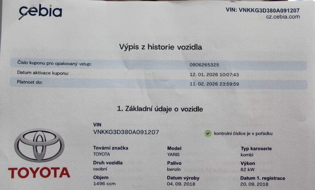 2018 Toyota Yaris 1.5i 82 kW s jedním majitelem a plně vyplněnou papírovou servisní knihou je férová volba pro každodenní dojíždění; kde se počítá spolehlivost a nízké provozní náklady. Atmosférická čtyřválcová patnáctistovka (motor 2NR) s 6stupňovým manuálem je jednoduchá; prověřená technika bez zbytečné složitosti a hodí se do města i na okresky. Vysoký nájezd odpovídá pravidelnému používání; důležité ale je; že vůz má doloženou servisní historii a platnou STK až do 08/2026; takže můžete řešit provoz bez okamžitých starostí. Ve výbavě potěší Bluetooth; dálkové centrální zamykání; multifunkční kožený volant; litá kola a zadní parkovací kamera; nechybí ani rozpoznávání dopravních značek a varování před čelní srážkou. Pokud hledáte dostupný; poctivě vedený Yaris s jasným původem; domluvte si prohlídku a zkušební jízdu.;
