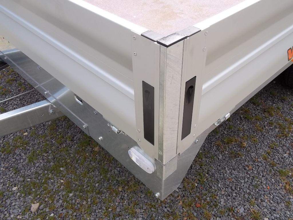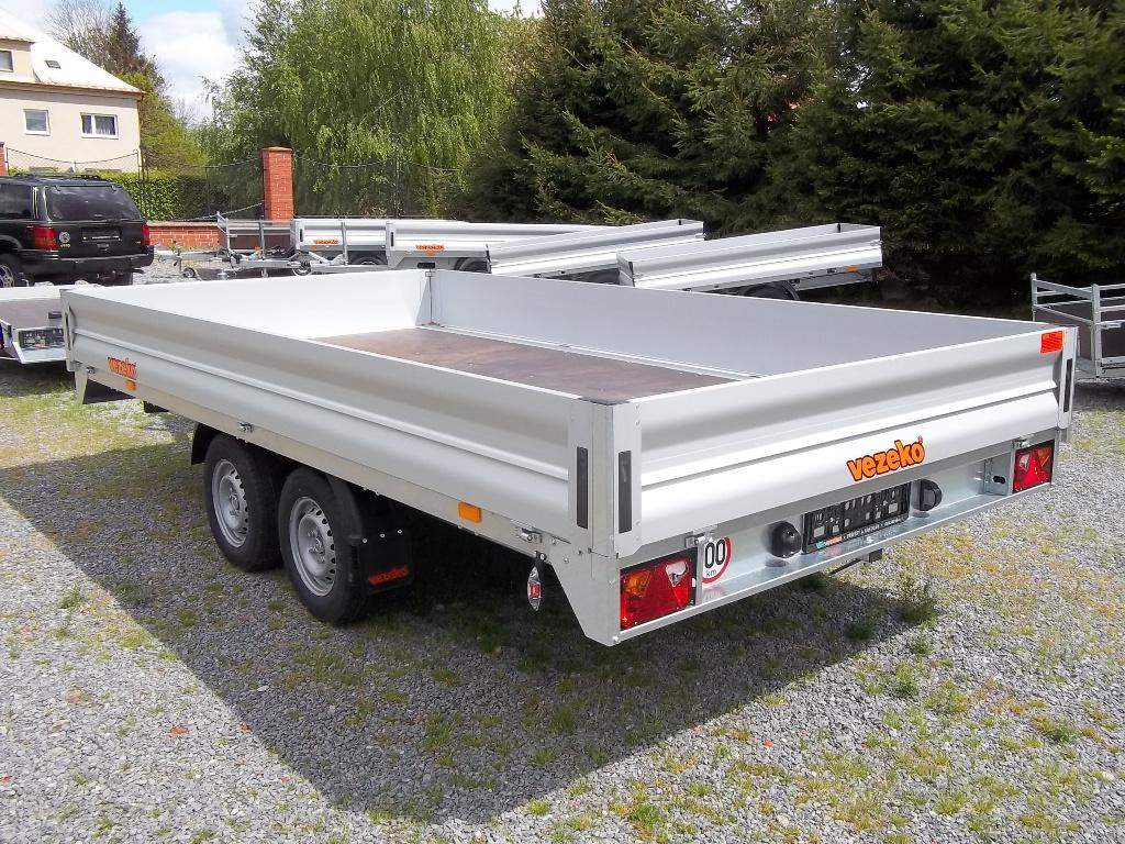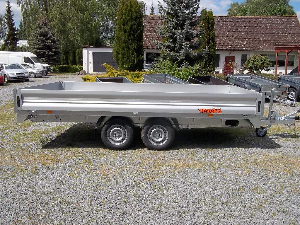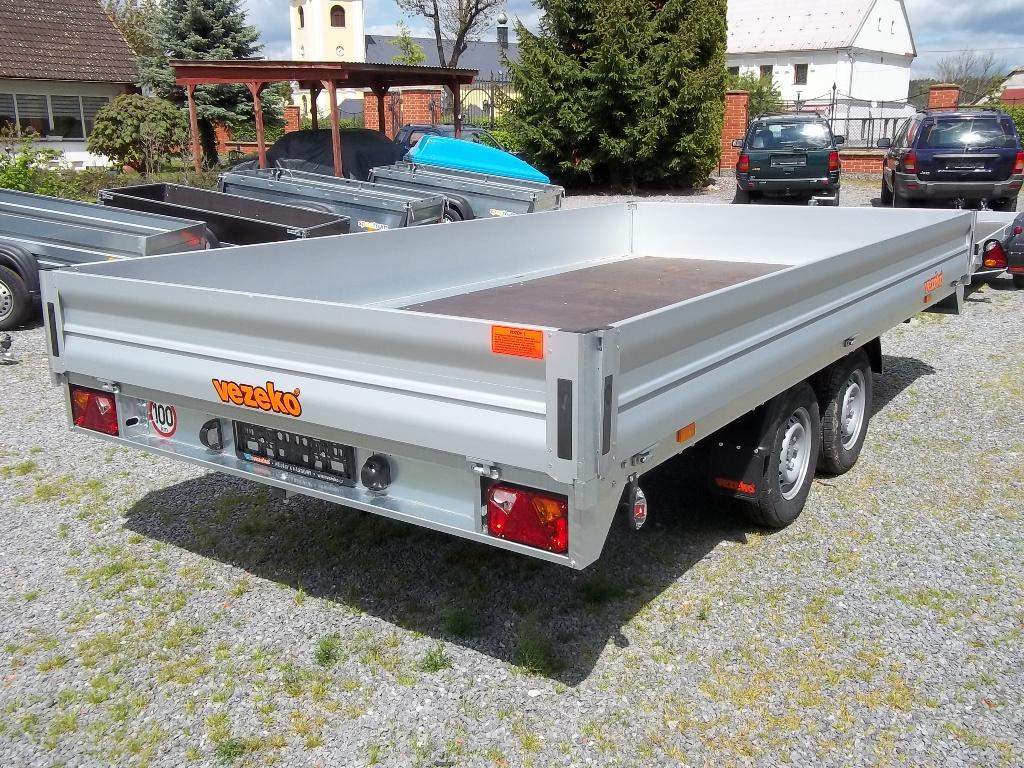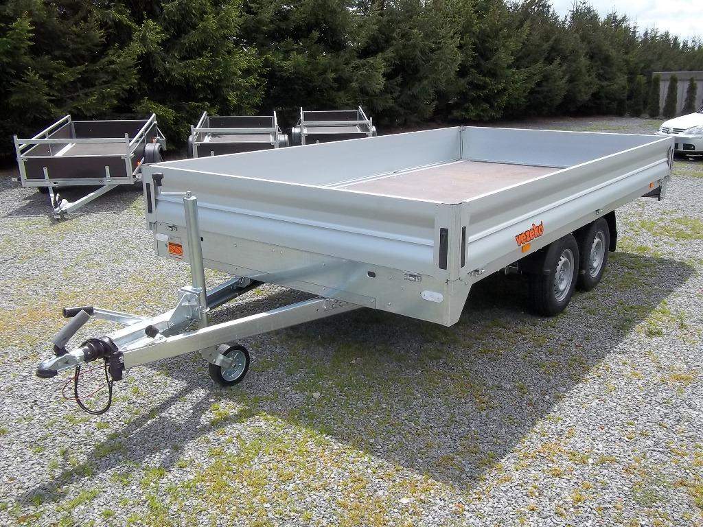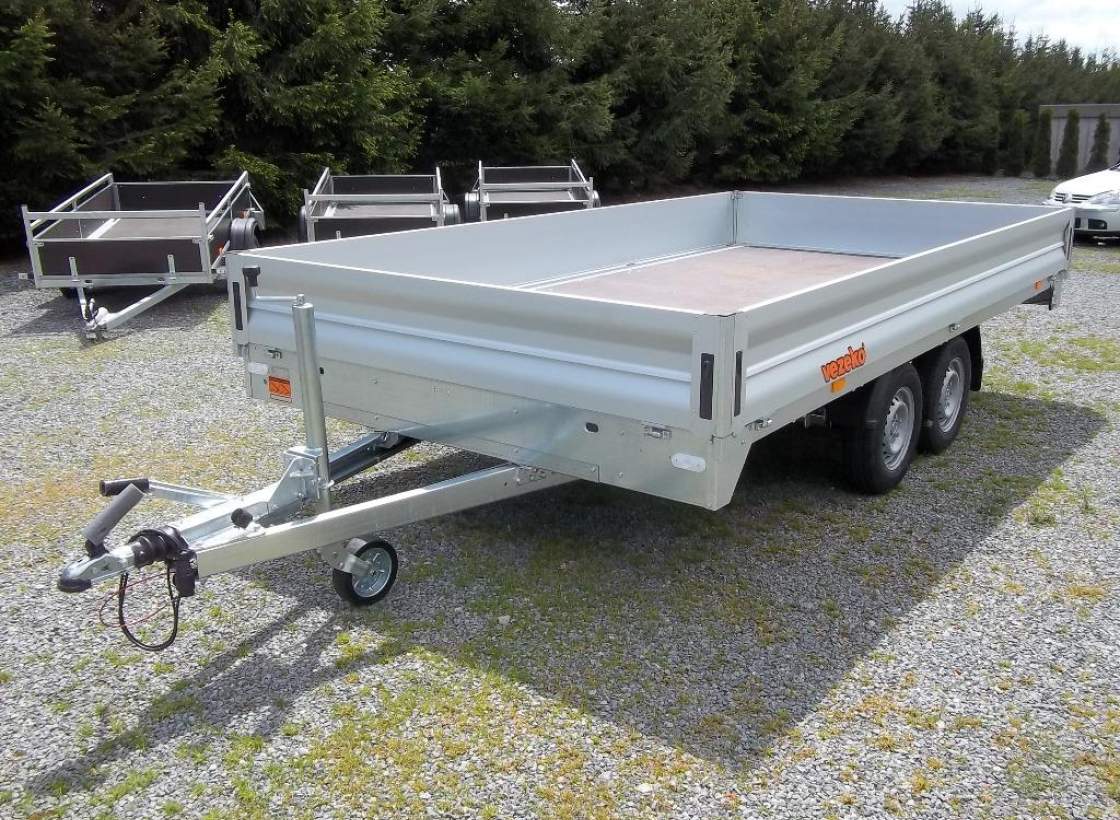První majitel; NOVÝ dvounápravový brzděný přívěs. Celková hmotnost 2700 kg Brzděný nájezdovou brzdou Ložná plocha 4170 x 2150 mm Montovaný rám ze zinkovaných dílů Hliníkové bočnice otevíratelné 350 mm Podlaha z voděodolné protiskluzové překližky 15 mm Kotvící oka v rámu 8 ks Opěrné kolečko Zakládací klíny; Kola 13' - 165 R 13C;;