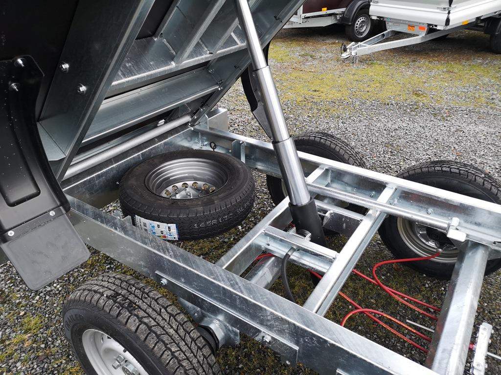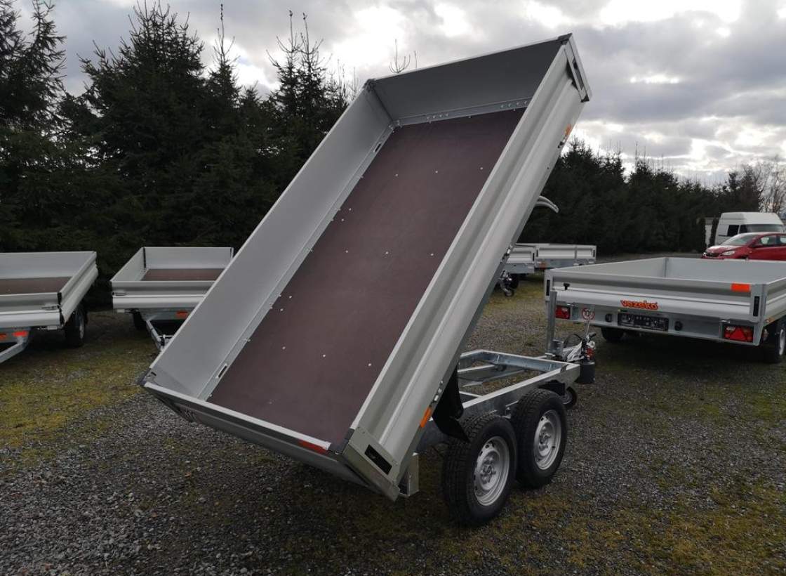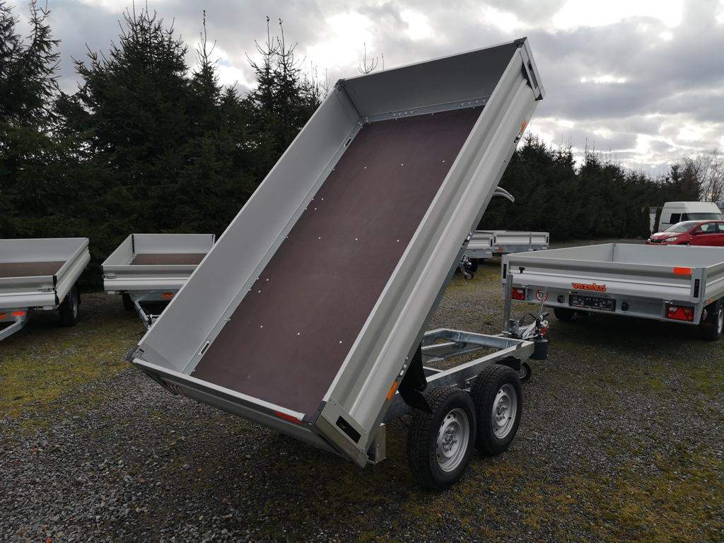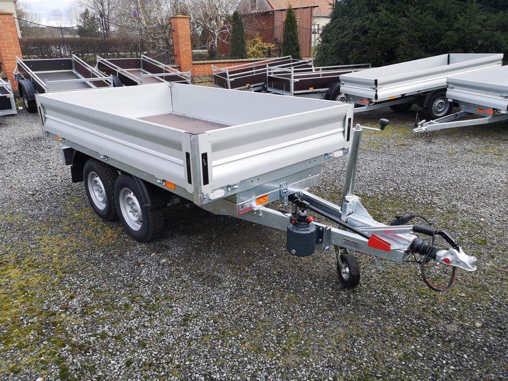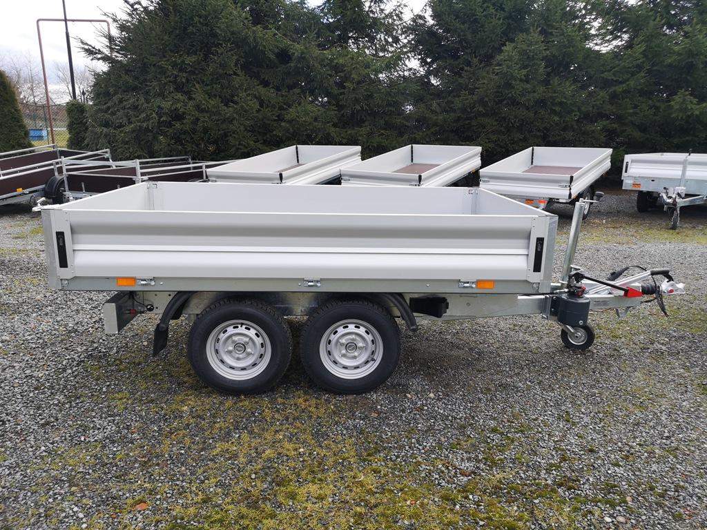 První majitel; Nový dvounápravový brzděný přívěs dozadu sklopný pomocí ruční hydraulické pumpy. Celková hmotnost 2700 kg Brzděný nájezdovou brzdou Ložná plocha 2600 x 1520 mm Hydraulické ruční sklápění Hliníkové otevírací bočnice 350 mm Profi uzávěry; rohovésloupky Kovové panty Podlaha z voděodolné překližky Kotvící oka v rámu 4 ks Opěrné kolečko Zakládací plastové klíny Kola 13“ – 165 R 13C Rezevní kolo;;