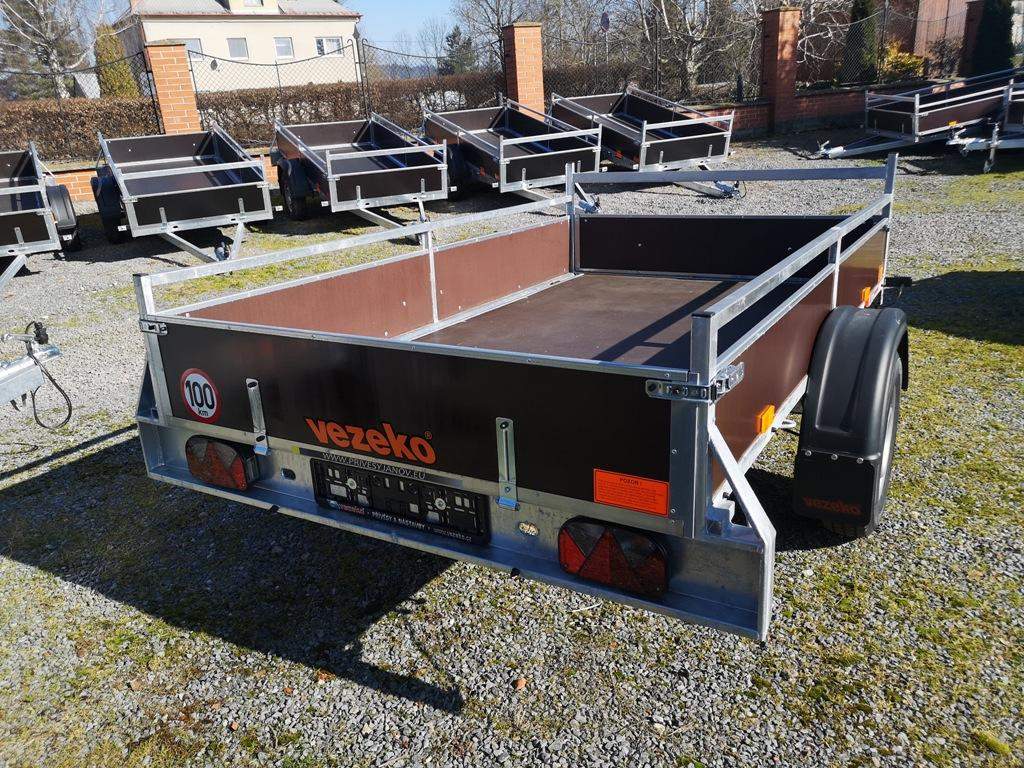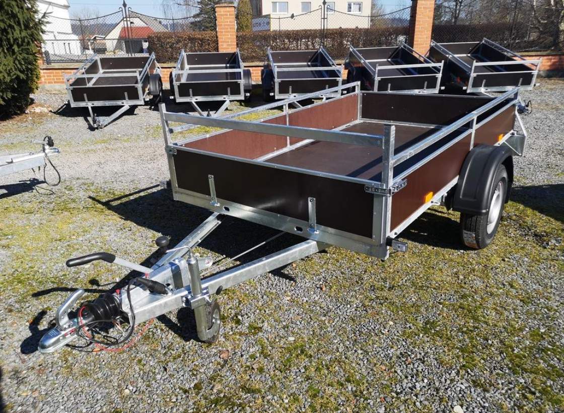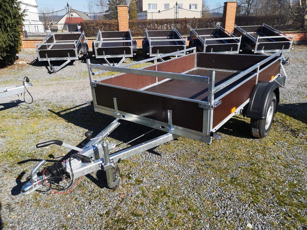 První majitel; Jednonápravový brzděný přívěs. Celková hmotnost 1300 kg; Brzděný nájezdovou brzdou; Přední čelo otevírací; Ložná plocha 2520 x 1470 mm; Robustní svařovaný rám; Bočnice z voděodolné překližky 300 mm; Svařovaný reling – jaklová ohrádka 100 mm; Podlahaz voděodolné protiskluzové překližky 15 mm; Pogumovaná kotvící oka zapuštěná v rámu 4 ks; Navařená venkovní oka na rámu 4 ks; Prolisované upínací otvory v předním a zadním korytě 4 ks; Opěrné kolečko; Zakládací plastové klíny Kola 13“ – 165 R 13C;;