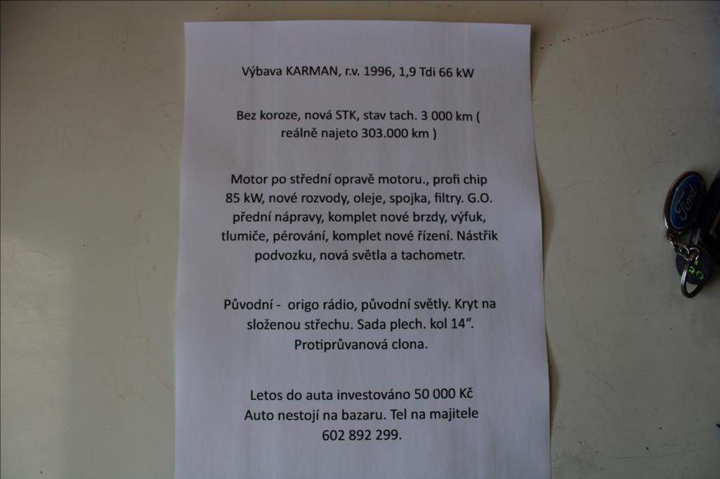 Pátý majitel; VÝBAVA KARMAN. BEZ KOROZE; STK 8/2027; STAV TACHOMETRU 2.494 KM ( REALNÉ KM : 302.494 KM ). MOTOR PO STŘEDNÍ OPRAVĚ MOTORU; PROFI CHIP NA 85kw; NOVÉ ROZVODY; OLEJE; SPOJKA; FILTRY. GO PŘEDNÍ NÁPRAVY; KOMPLET NOVÉ BRZDY; VÝFUK; TLUMIČE; PÉROVÁNÍ; KOMPLET NOVÉ ŘÍZENÍ. NÁSTŘIK PODVOZKU; NOVÁ SVĚTLA. AUTO NESTOJÍ NA BAZARU - TELEFON NA MAJITELE : 602 892 299.;