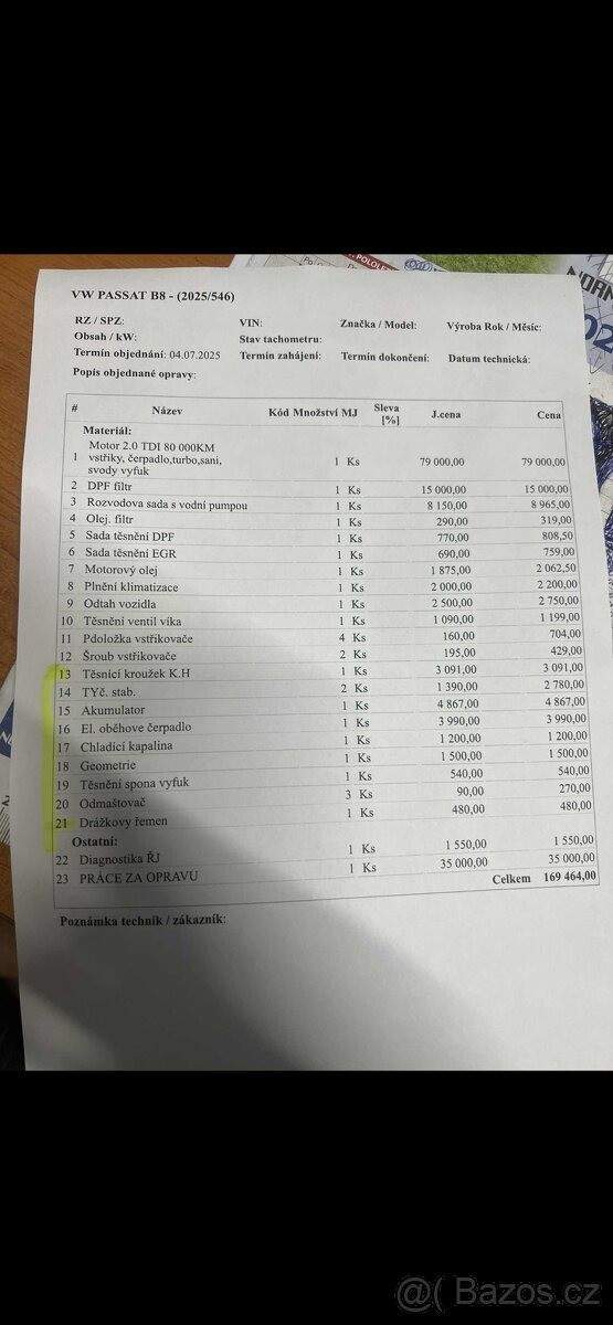 TEL: 776246940 OKR: BRNO Dobrý den; prodávám passat b8 comfortline -2016 -2.0 tdi 110kw -manuál -nájezd 285xxx km; teď motor 122xxx km -na motorové věci záruka půl roku; v příloze faktura; co vše bylo na autě děláno; oprava proběhla při 243xxx km -spojka dělána při 230xxx km; najeto 50xxx km -auto garážované a udržované -pečlivě staráno -každého půl roku ochrana laku -důvod prodeje : koupě nového vozu -při rychlém jednání sleva Více info po telefonu : 776 246 940;