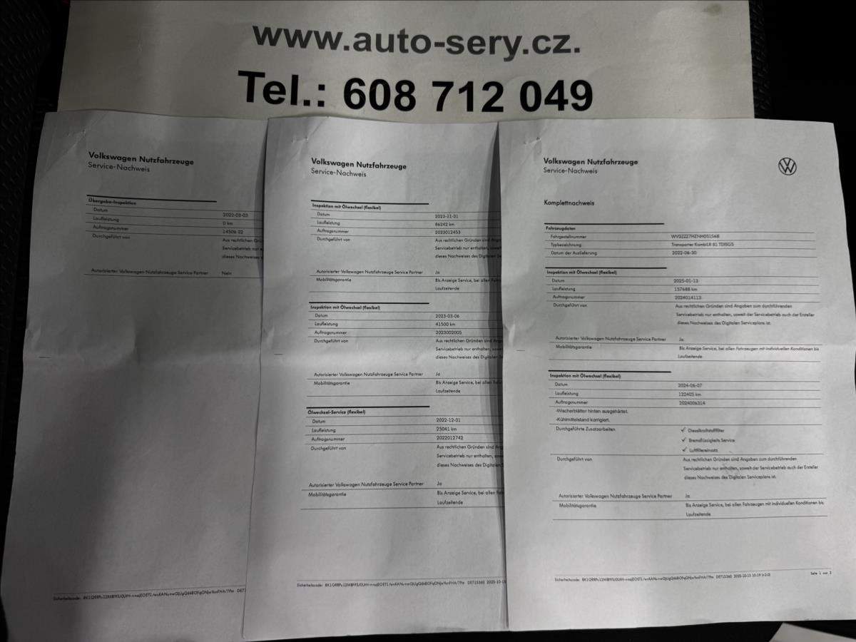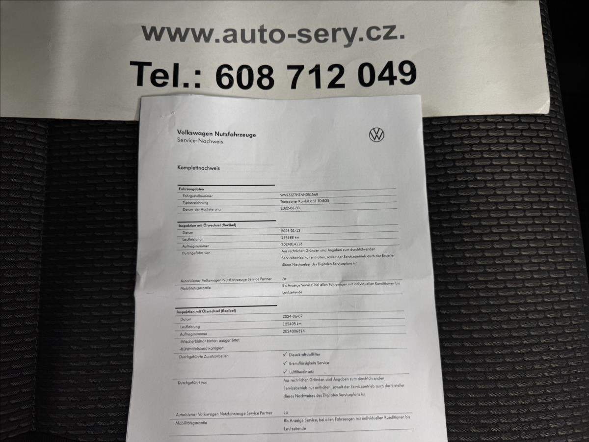 Záruka 1rok/20.000km v ceně vozu. Možný odpočet DPH; servisováno pouze u VW; poslední servis 1/25 při 157.688 km; vůz z výroby 9 místný; ve voze fyzicky 3 sedadla; délka ložné plochy 290cm; výška 187cm; s vozidlem je možno ihned odjet. Údaje obsažené v této kartě vozu mají informativní charakter a nemohou zachytit veškeré detaily stavu a výbavy vozidla. Podrobný popis stavu a výbavy bude ověřen až v okamžiku poptávky koupě. Z této indikativní nabídky nevzniká nárok na uzavření smlouvy.;